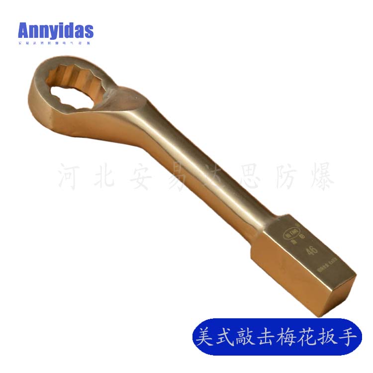 防爆美式敲擊梅花扳手采用鋁青銅合金/鈹青色銅合金鑄成,表面采用拋光處理,敲擊摩擦不產(chǎn)生火花。型號齊全,多用于易燃易爆場所美式敲擊梅花扳手采用鋁青銅合金/鈹青色銅合金鑄成,表面采用拋光處理,敲擊摩擦不產(chǎn)生火花。型號齊全,多用于易燃易爆場所。敲擊扳手是一類重要的手動扳手,一般是指手持端為敲擊端,前端為工作端。主要包括敲擊梅花扳手和敲擊呆扳手兩種形式。 適用于工作空間狹小,不能使用普通扳手的場合。用來擰出六角頭螺栓或螺母。轉(zhuǎn)角較小,可用于只有較小擺角的地方(只需轉(zhuǎn)過板手1/2的轉(zhuǎn)角),且由于接解面大,可用于擰緊。 |
